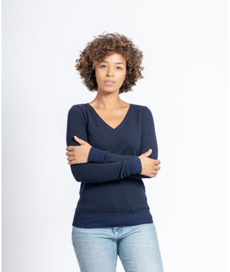 Le pull col V femme Fanny marine avec ses bords côtes au fil bleu argenté deviendra rapidement l'un des favoris de votre dressing.