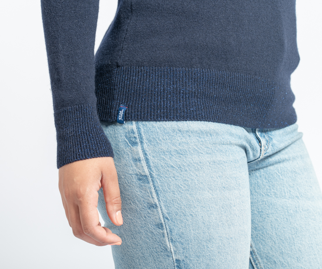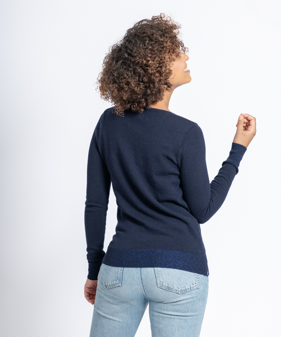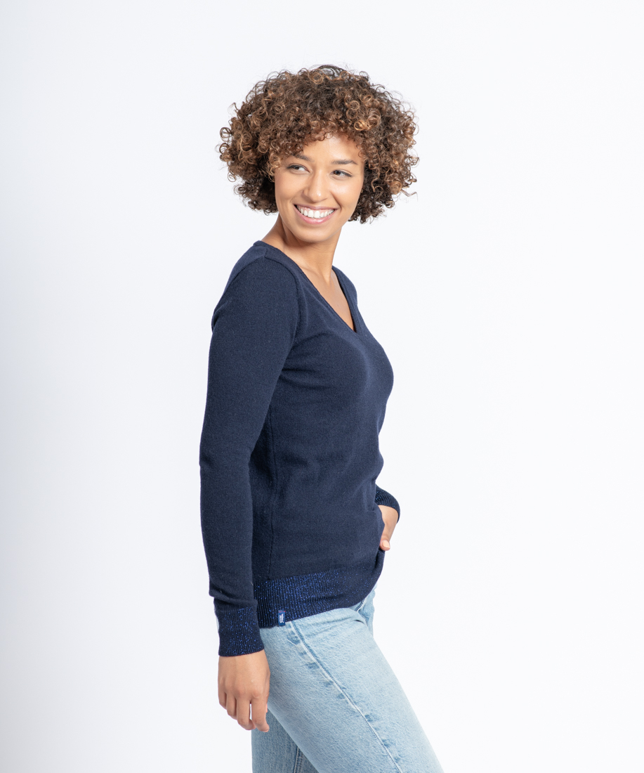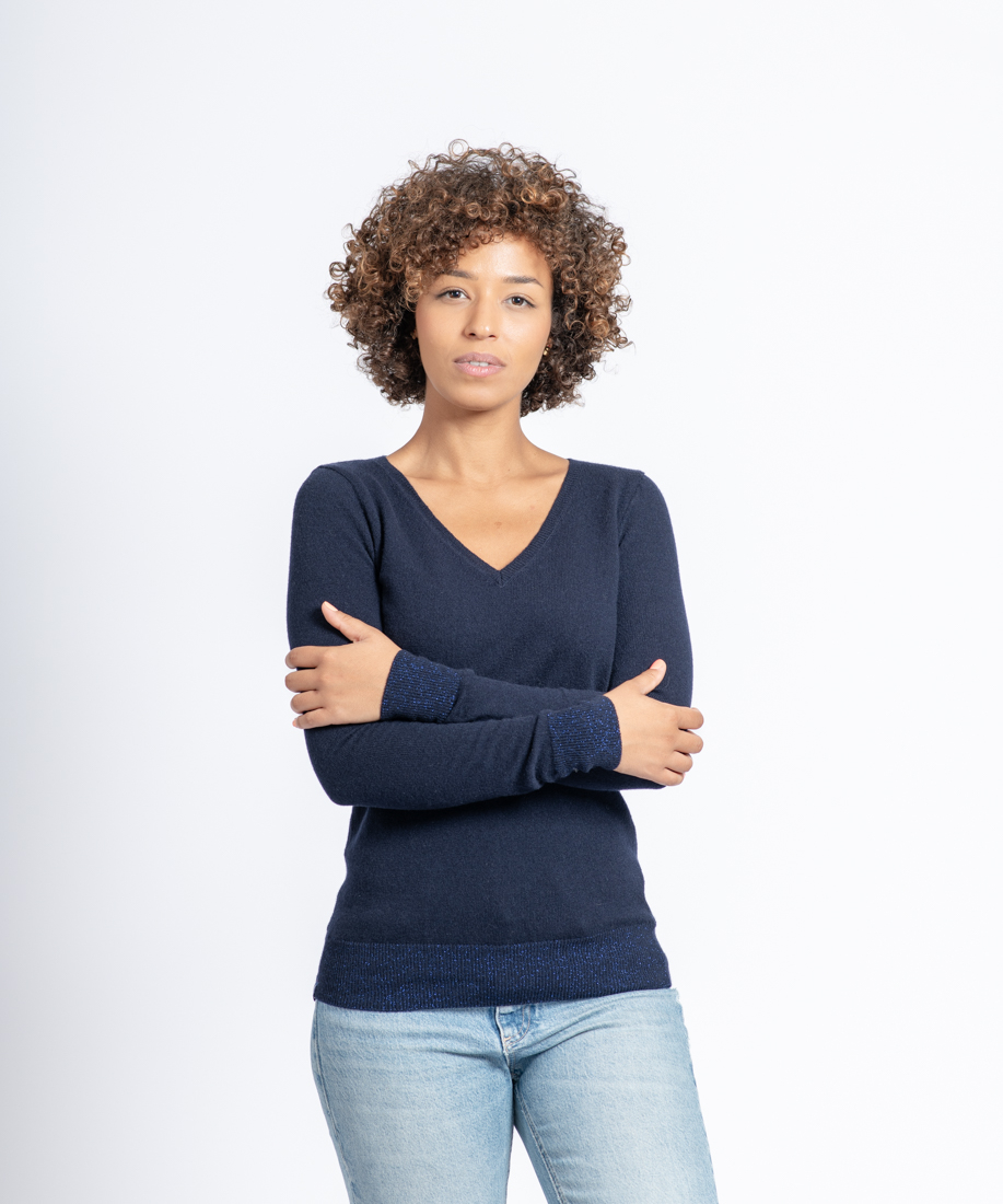Le pull col V femme Fanny marine avec ses bords côtes au fil bleu argenté deviendra rapidement l'un des favoris de votre dressing.