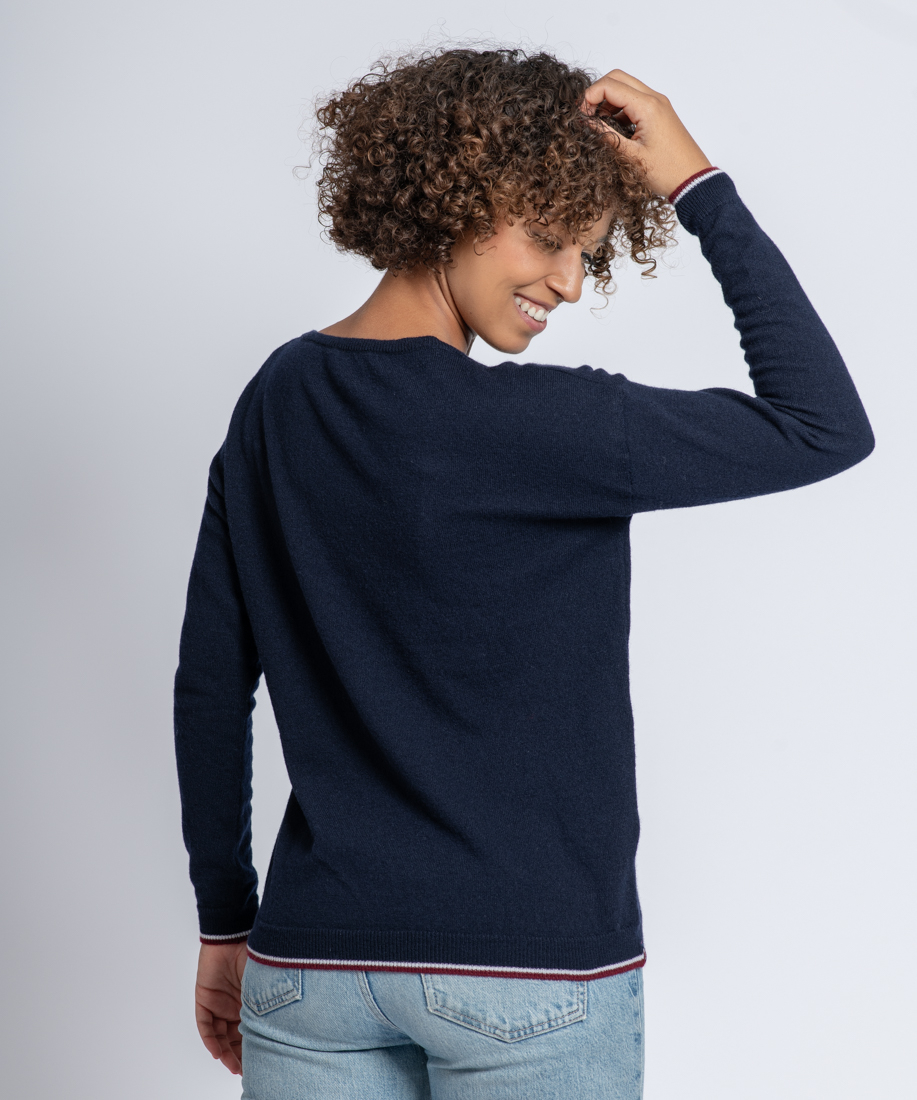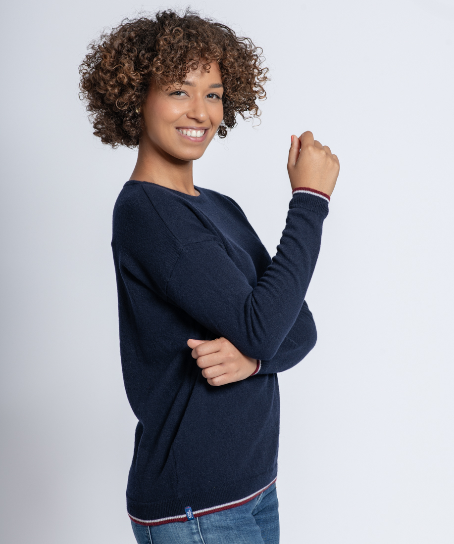 Le col, les manches et les bords côtes bleu blanc rouge de ce pull femme sont entièrement remaillés à la main avec une reprise maille par maille. Cela donne une couture très fine à peine perceptible au toucher et surtout qui offre un grand confort au porté.