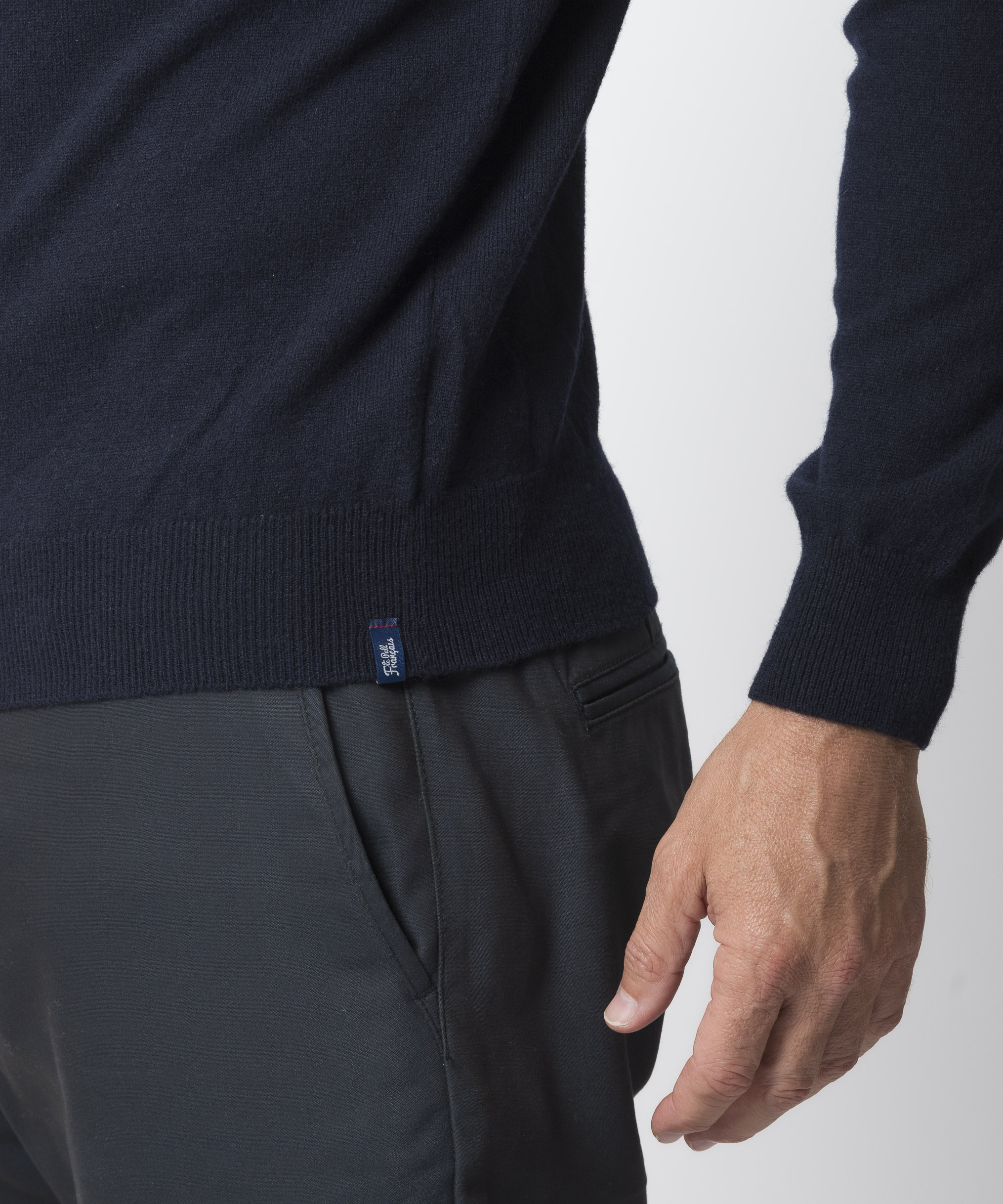 Le col, les manches et les bords côtes de ce pull homme sont entièrement remaillés à la main avec une reprise maille par maille. Cela donne une couture très fine à peine perceptible au toucher et surtout qui offre un grand confort au porté.