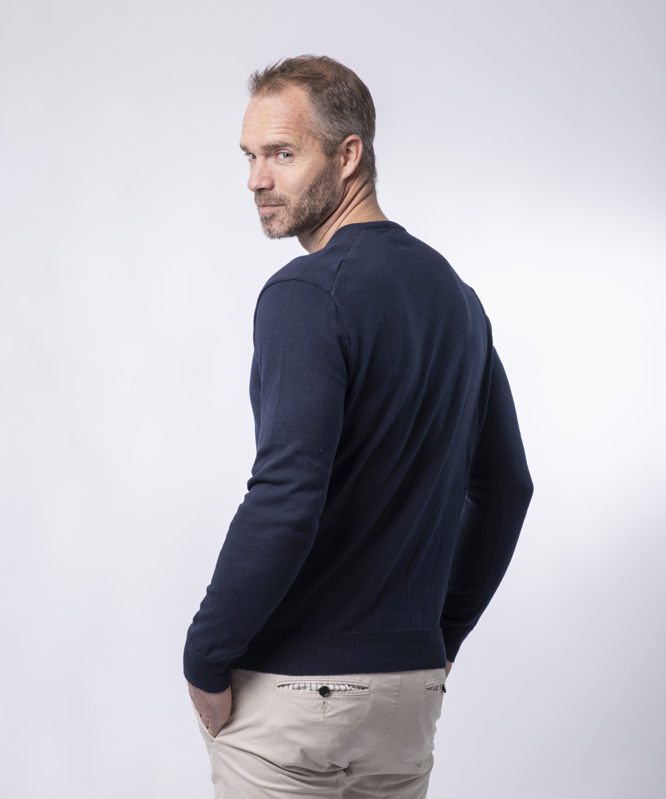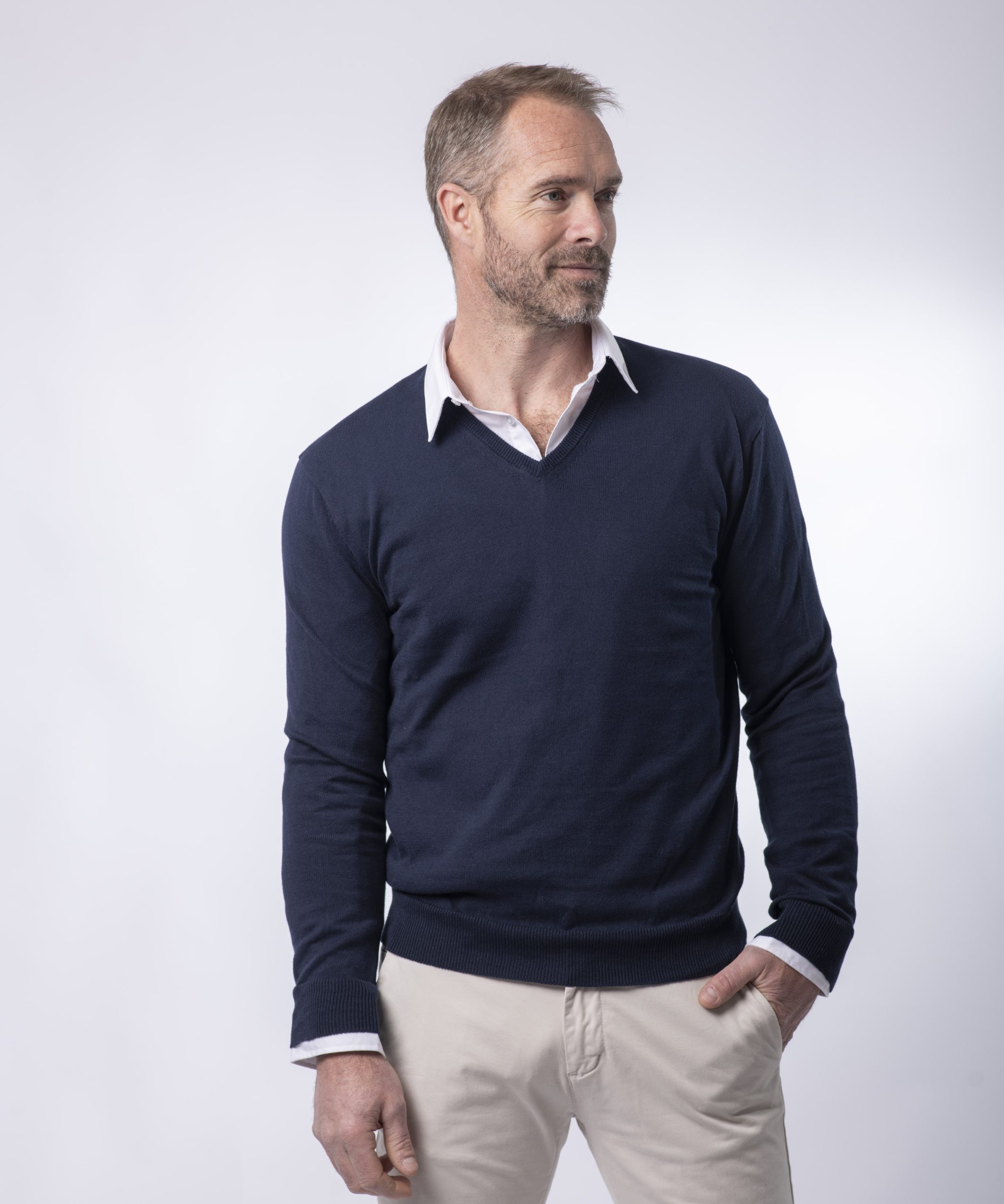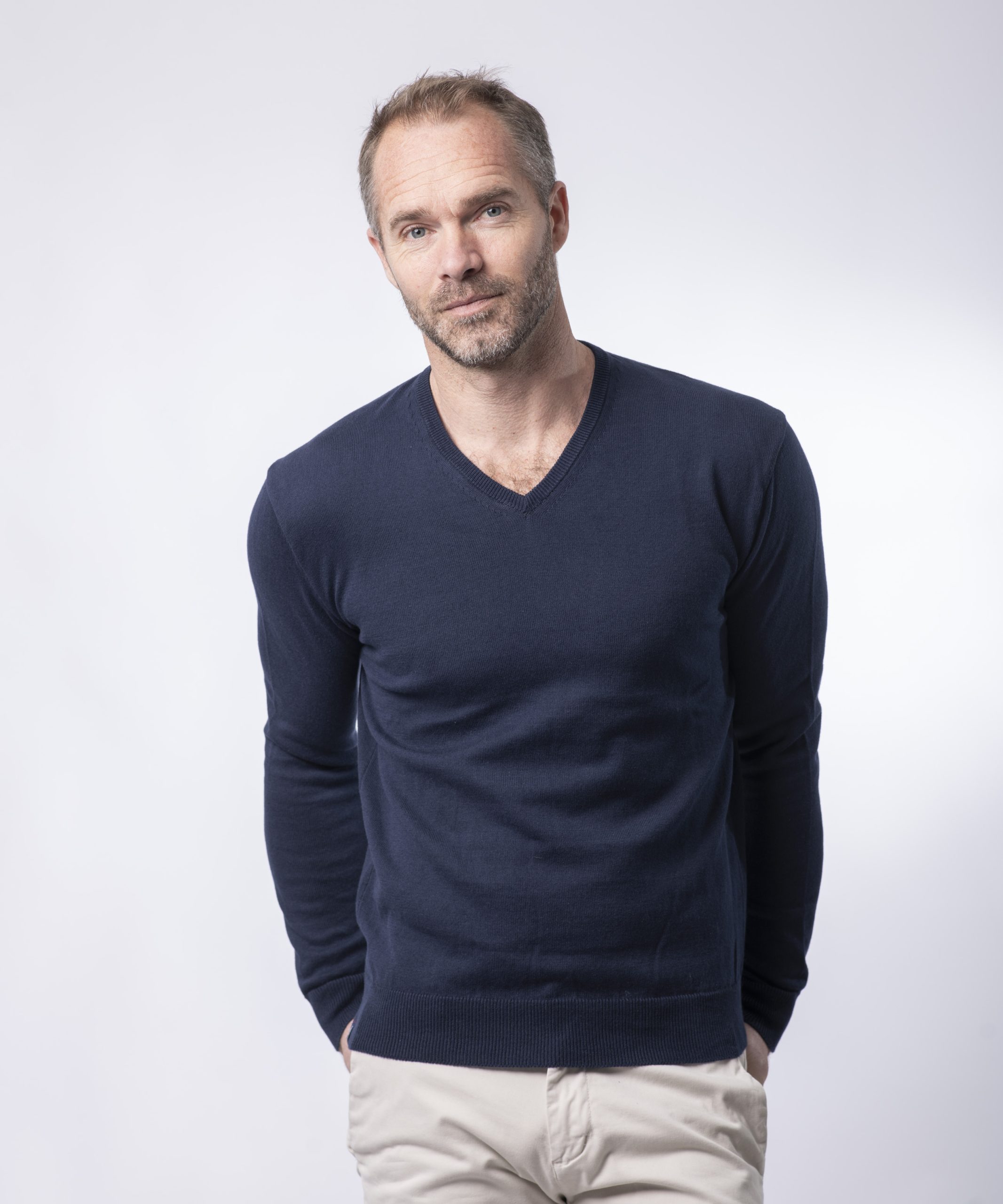 Le pull col V homme César marine en coton bio est un incontournable de la garde robe masculine