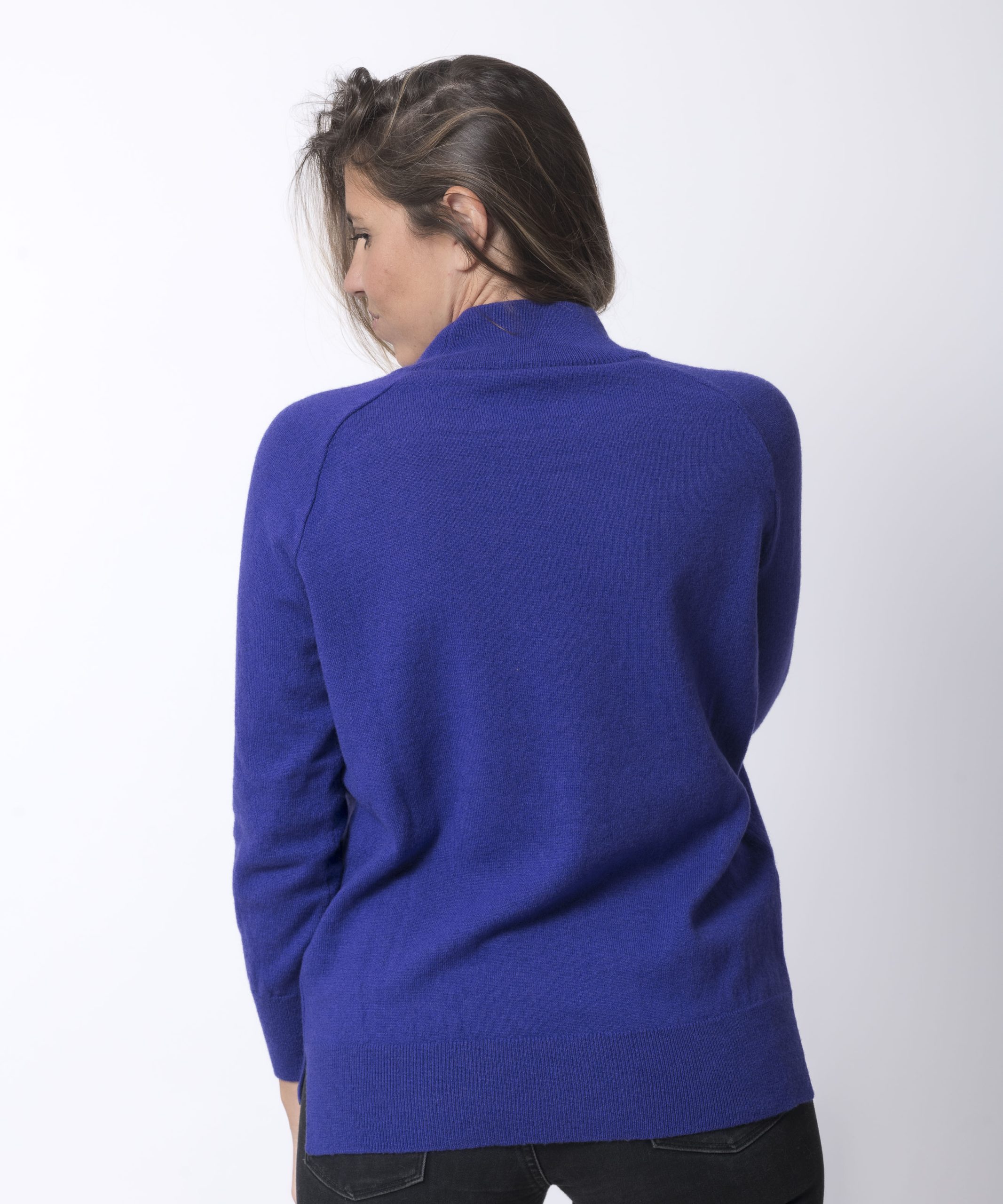 Ce pull col montant fabriqué en France se situe, à mi-chemin entre le col rond et le col roulé, dans un style moderne et chic.