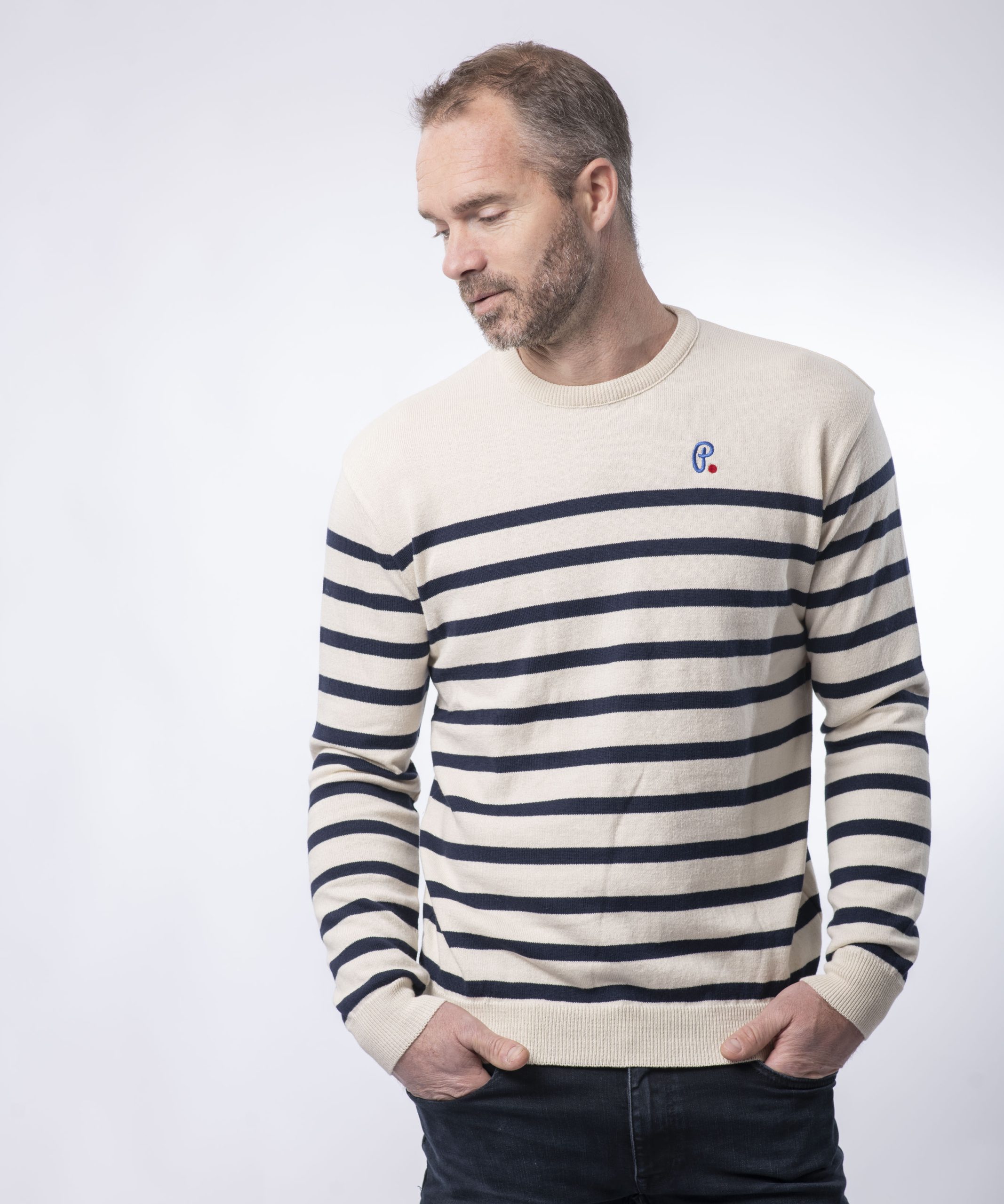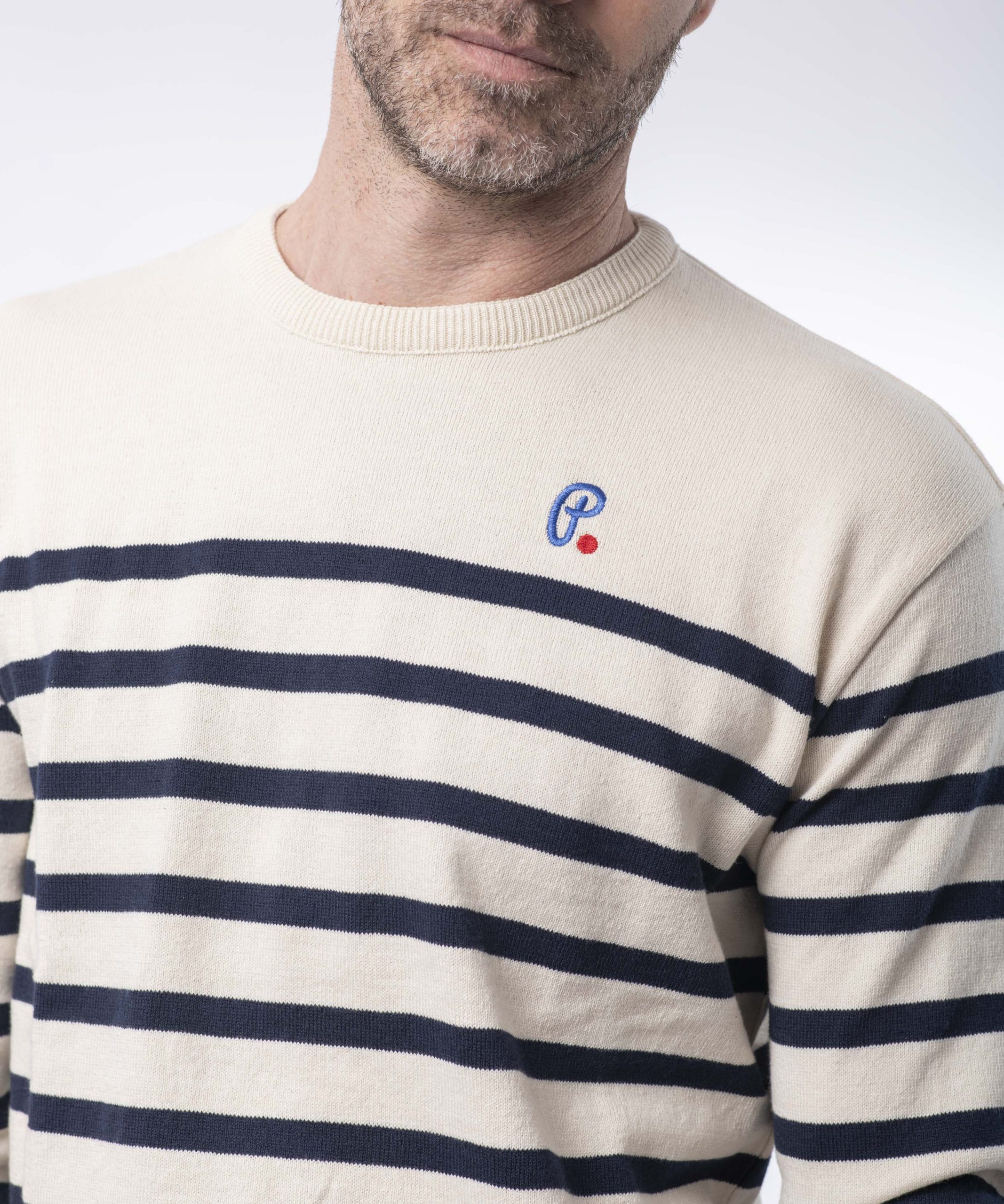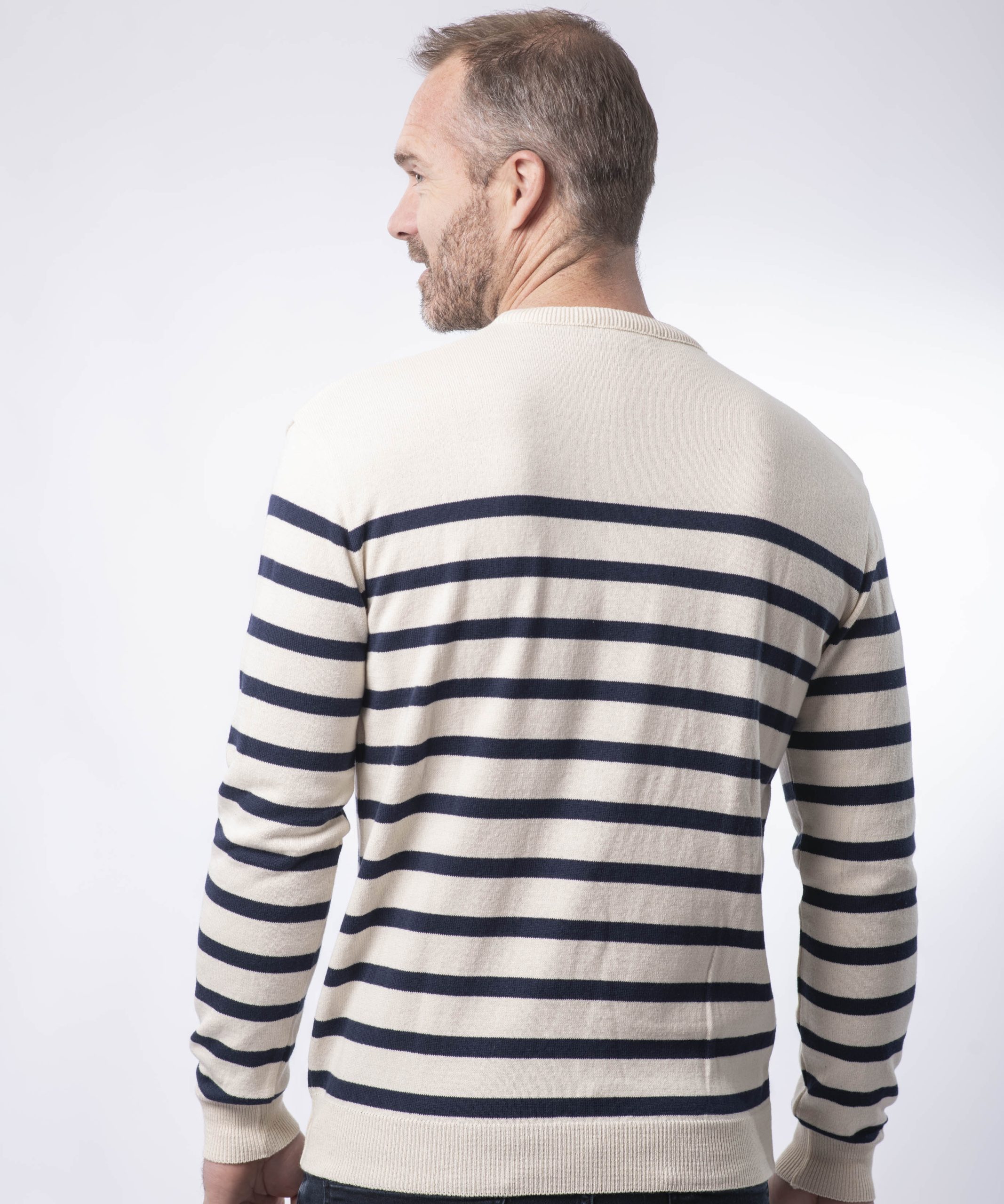 Le modèle Marin col rond pour homme, en écru et en coton bio reste un incontournable de la garde robe masculine