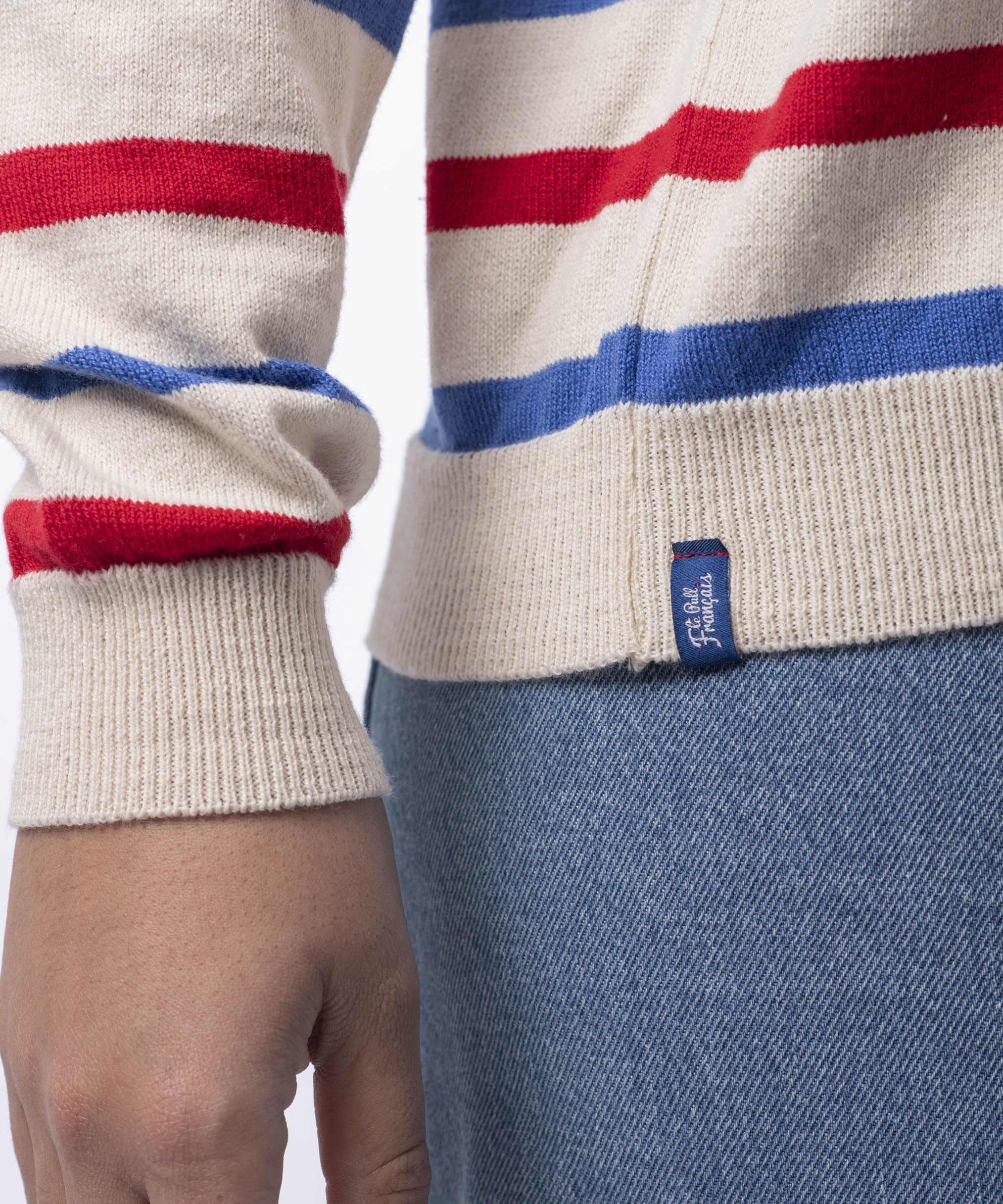La vignette située au bas du pull est signée au nom de la marque pour une finition soignée et discrète. Pour la signature, comme pour l'ensemble de nos étiquettes, nous avons choisi la fabrication française et la matière la plus soyeuse, car même dans les détails, nous souhaitons une qualité irréprochable !