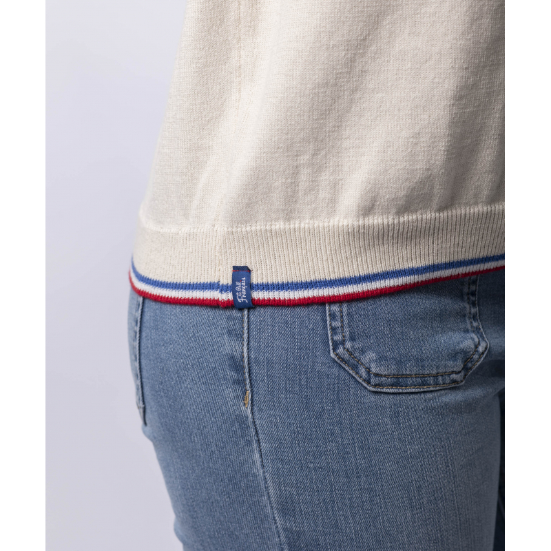 Le col, les manches et les bords côtes bleu blanc rouge de ce pull femme 100% Made In France sont entièrement remaillés à la main. Cela donne une couture très fine à peine perceptible au toucher et surtout qui offre un grand confort au porté.